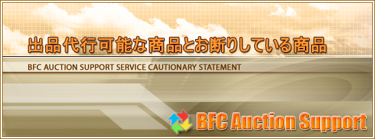BFCオークションサポートでは偽物商品の取扱をしておりませんのでその防止として商品チェック を商品到着後当社スタッフがさせていただきますが予めご了承ください。 ブランド商品等の高額商品に関しては原則として、その商品の真偽性を確認できるもの (ギャランティカード・保証書類)を添付いただけますようお願い申し上げます。 上記証明書がない場合、商品の出品代行は承りますが、出品ページにてその旨記載させて いただきます。(落札者に誤解を与えない処置として) ご依頼いただいた商品の内容が、お申込いただいた内容と違う場合はいかなる場合も出品代行 をお断りさせていただきます。 オークション出品後のキャンセル・出品途中での出品条件等の変更は一切お受けできません のであらかじめご了承願います。